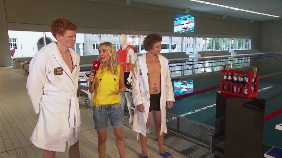 Schwimmen: Marco di Carli krault mit einem Kasten Bier!