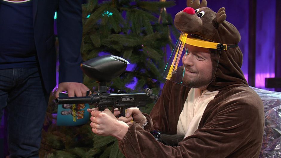 Heute moderiert niemand geringeres als Elton das Quiz in der Jagd-Edition. Der Gewinner darf den Verlierer mit einem Paintball-Gewehr abschießen. Spoiler: Es wird sehr schmerzhaft.