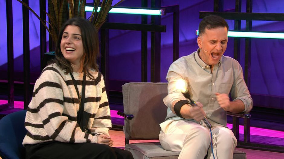 Jetzt wird's schmerzhaft. Quizmasterin Sprünky stellt Allgemeinwissensfragen, während Evelyn Burdecki Stromschläge an das Verlierer-Team verteilt.